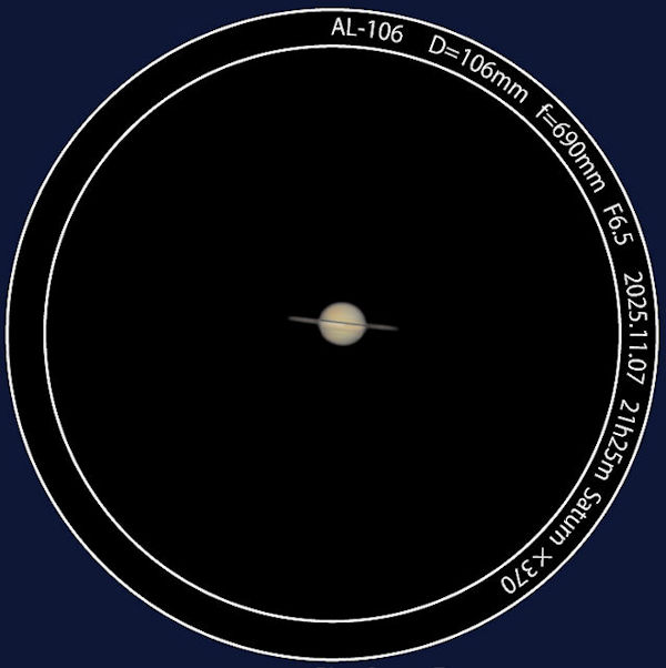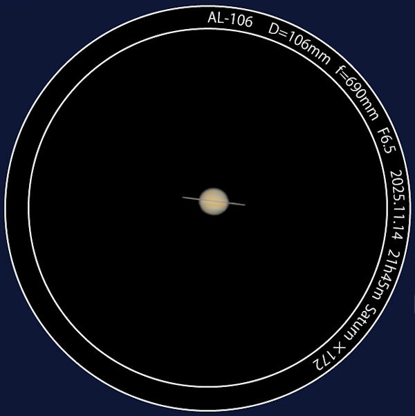 11月初旬,環の細くなっている土星観望。11月中旬の環のほぼ消失に向けて,10cmでいつまで見えるのか興味のあるところ。